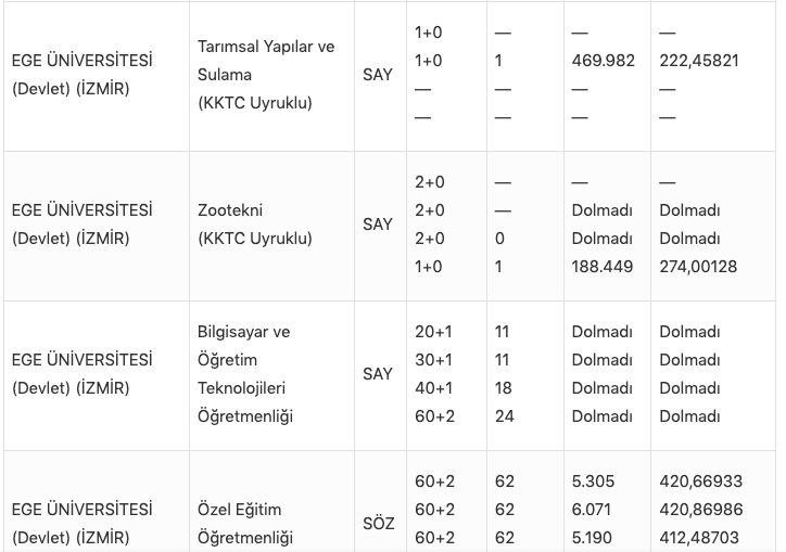 Ege üniversitesi taban puanları, kontenjan bilgileri ve başarı sıralamaları ile ilgili detaylar aşağıda ki tabloda yer almaktadır.